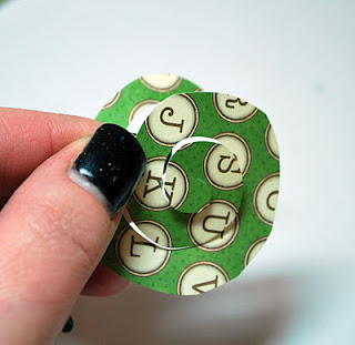 First, free cut a circle with your paper snips (I had approx. 2x2 dp scraps left over from my card front, so I used those...the teal flower is obviously made from a smaller square)....you DO NOT have to cut a perfect circle...the more 'off' the better, in my opinion! If you are uncomfortable with a wonky circle, feel free to punch a large circle out)...see the imperfection in my circle? Yep- it's wonky!